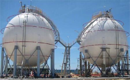 Spherical LNG Tanks are pressurized vessels used for storing liquefied naturals due to their strong, uniform stress distribution and lowest land-space requirement for pressurized storage. They are constructed with a primary inner shell and an outer shell, with insulation filled in between to maintain the extremely low temperature of LNG.